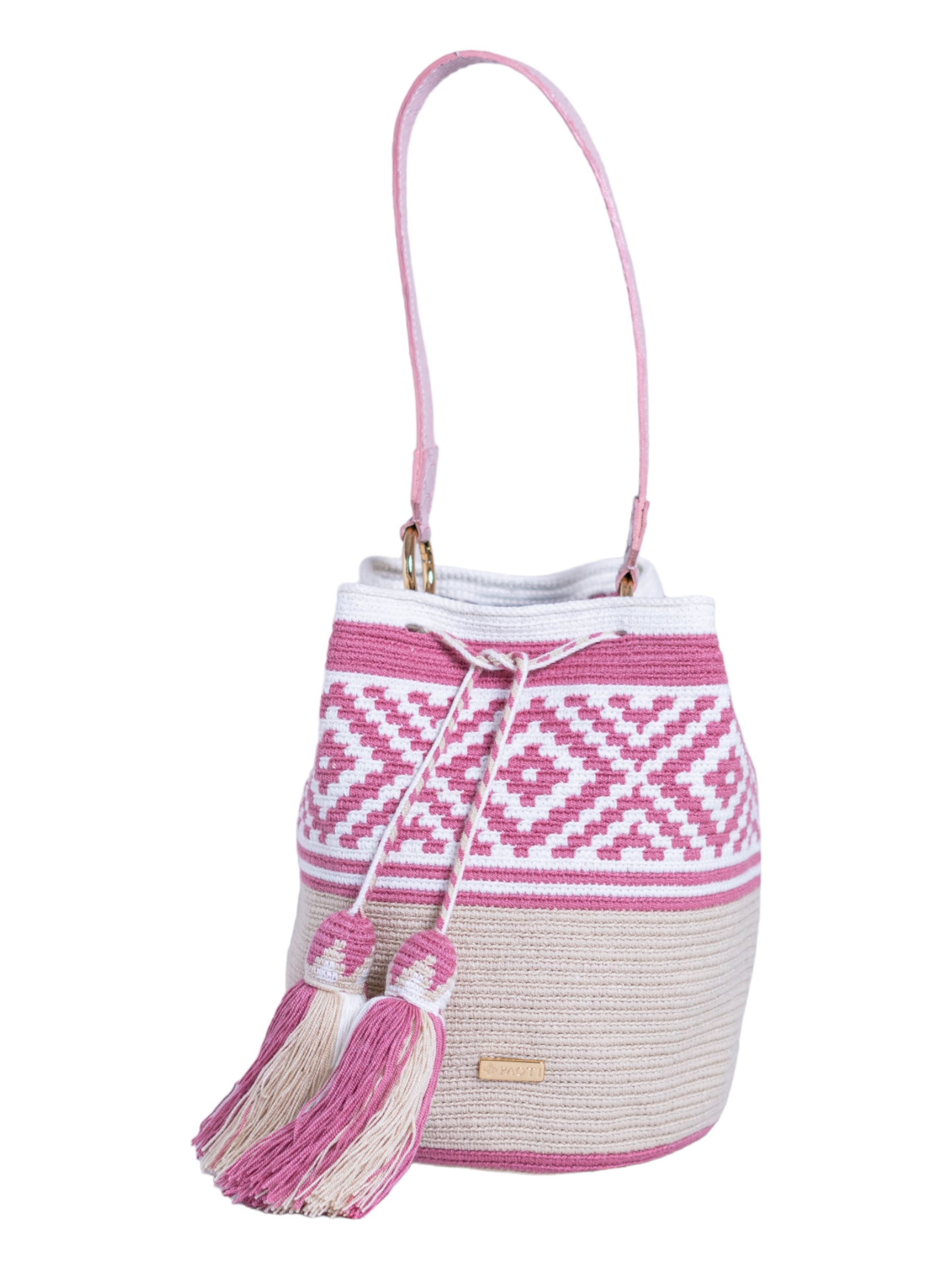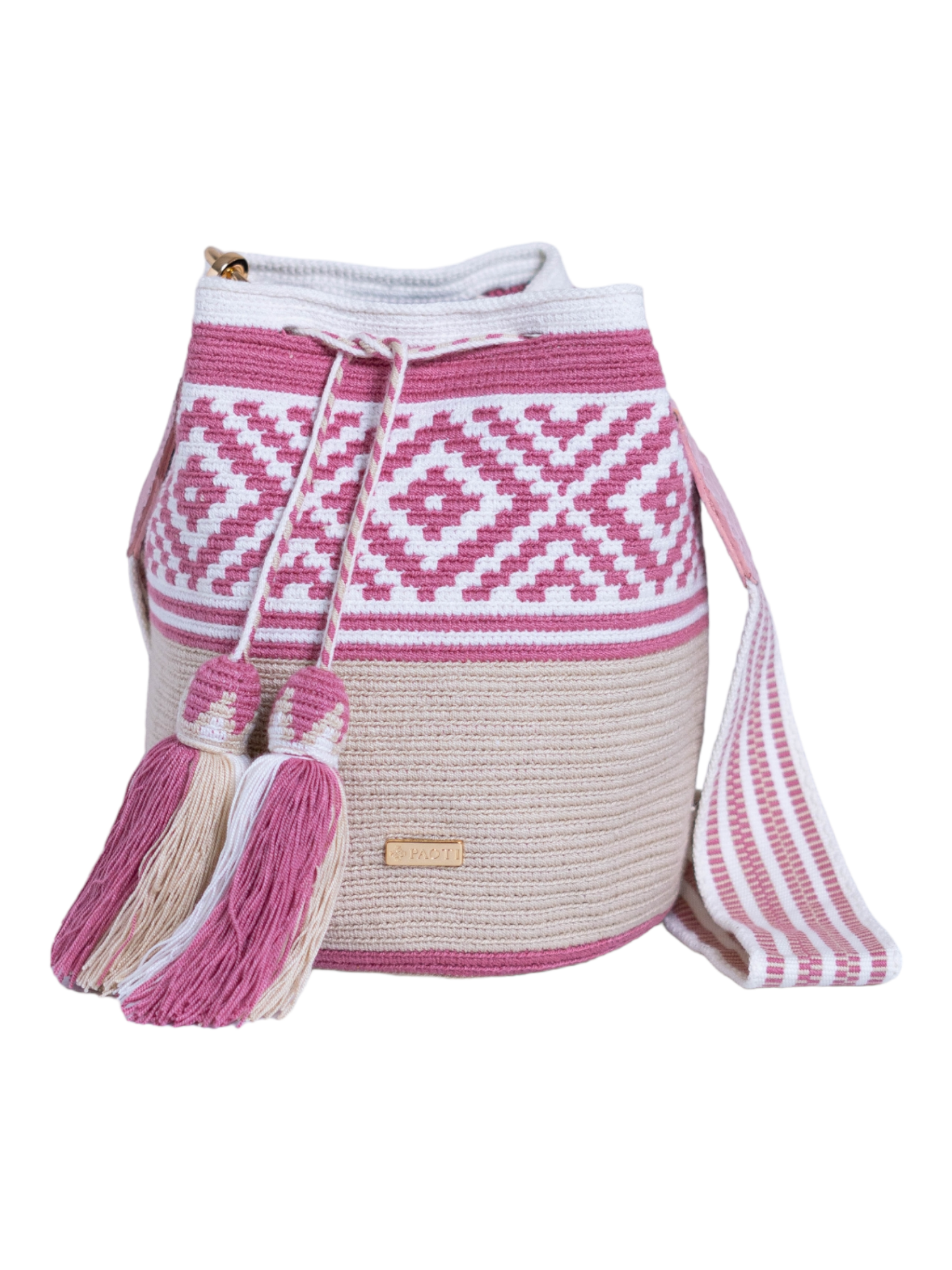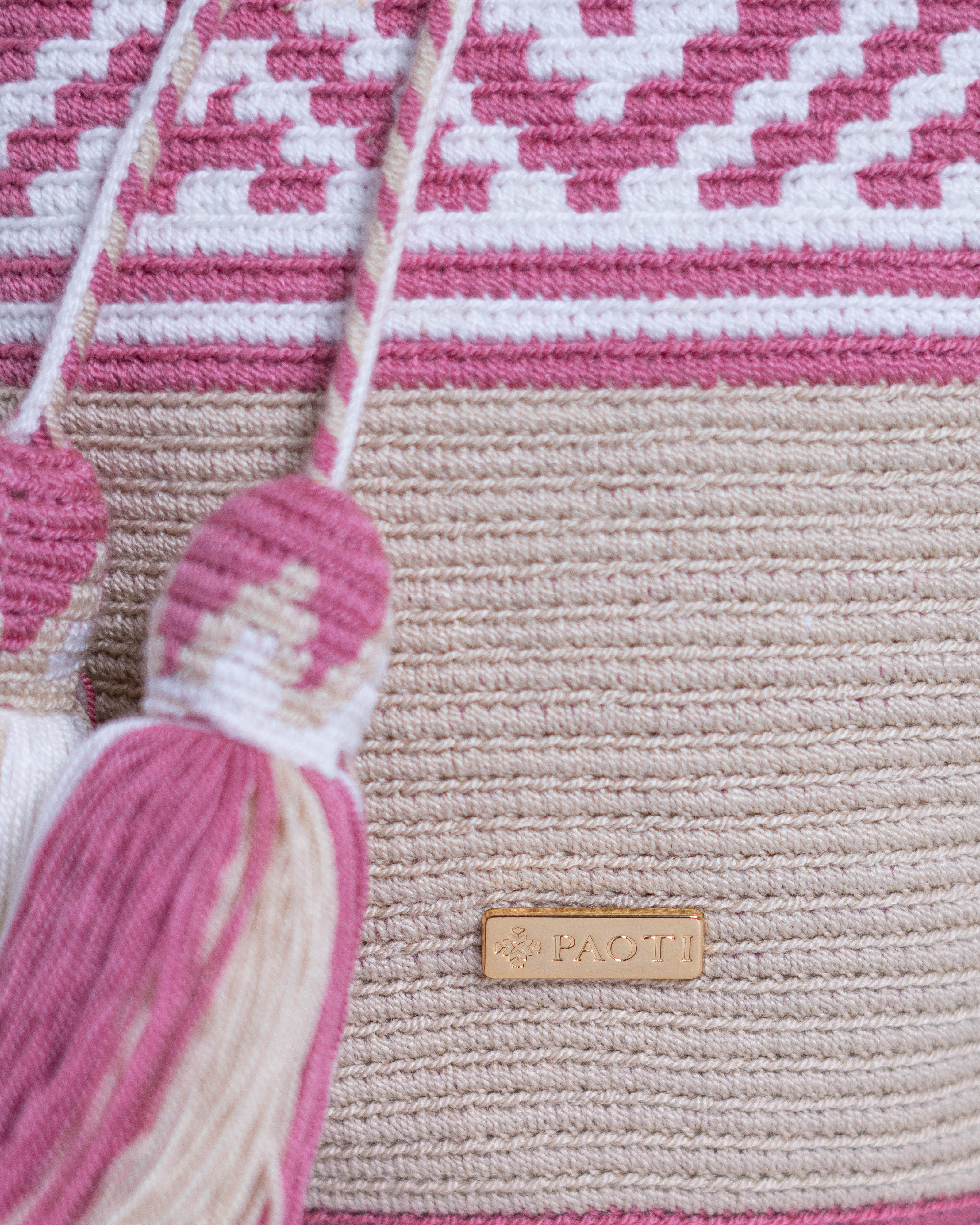 Cartera con diseño estampado en tonos beige, rosa y blanco, tejida a mano por mujeres pertenecientes a la tribu Wayuu de la alta Guajira colombiana. Presenta complementos en piel grabada animal print rosa, realizados por maestros marroquineros. Incluye dos correas intercambiables, una de piel y otra de tela, ambas hechas a mano con la mayor dedicación. El bolso está adornado con finos herrajes de la más alta calidad.