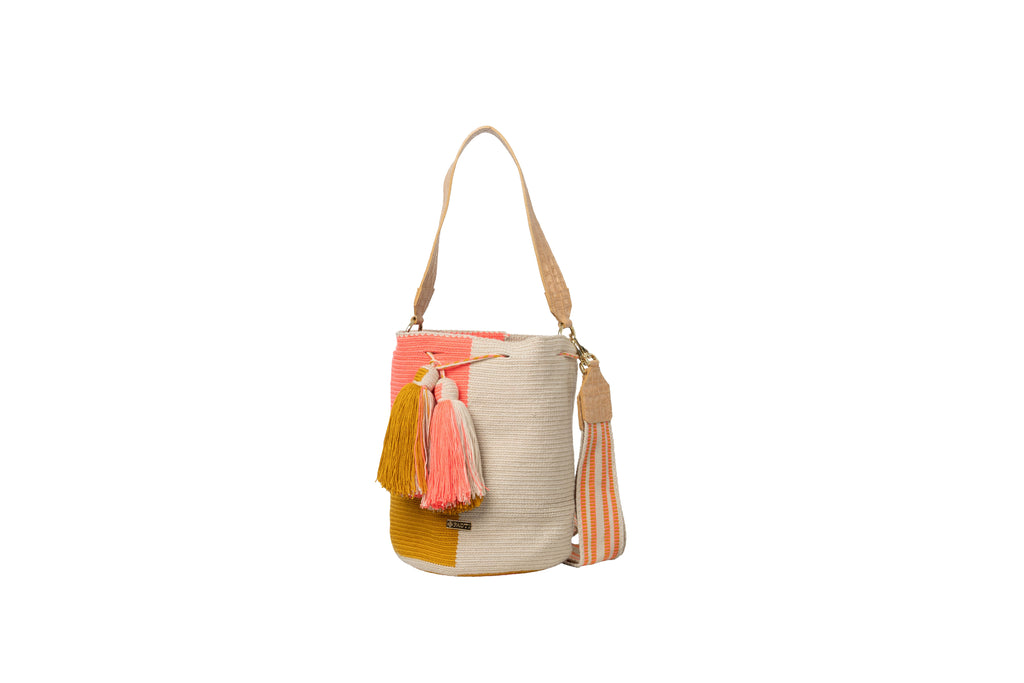 Mochila en colores beige, mostaza, y coral. tejida a mano por mujeres pertenecientes a la tribu Wayuu de la alta guajira Colombiana, con accesorios en cuero grabado animal print color piel elaborados por maestros artesanos marroquineros. Incluye dos straps intercambiables, uno en cuero y el otro tejido, ambos elaborados a mano con la mayor dedicación. La mochila está adornada con herrería fina de la más alta calidad