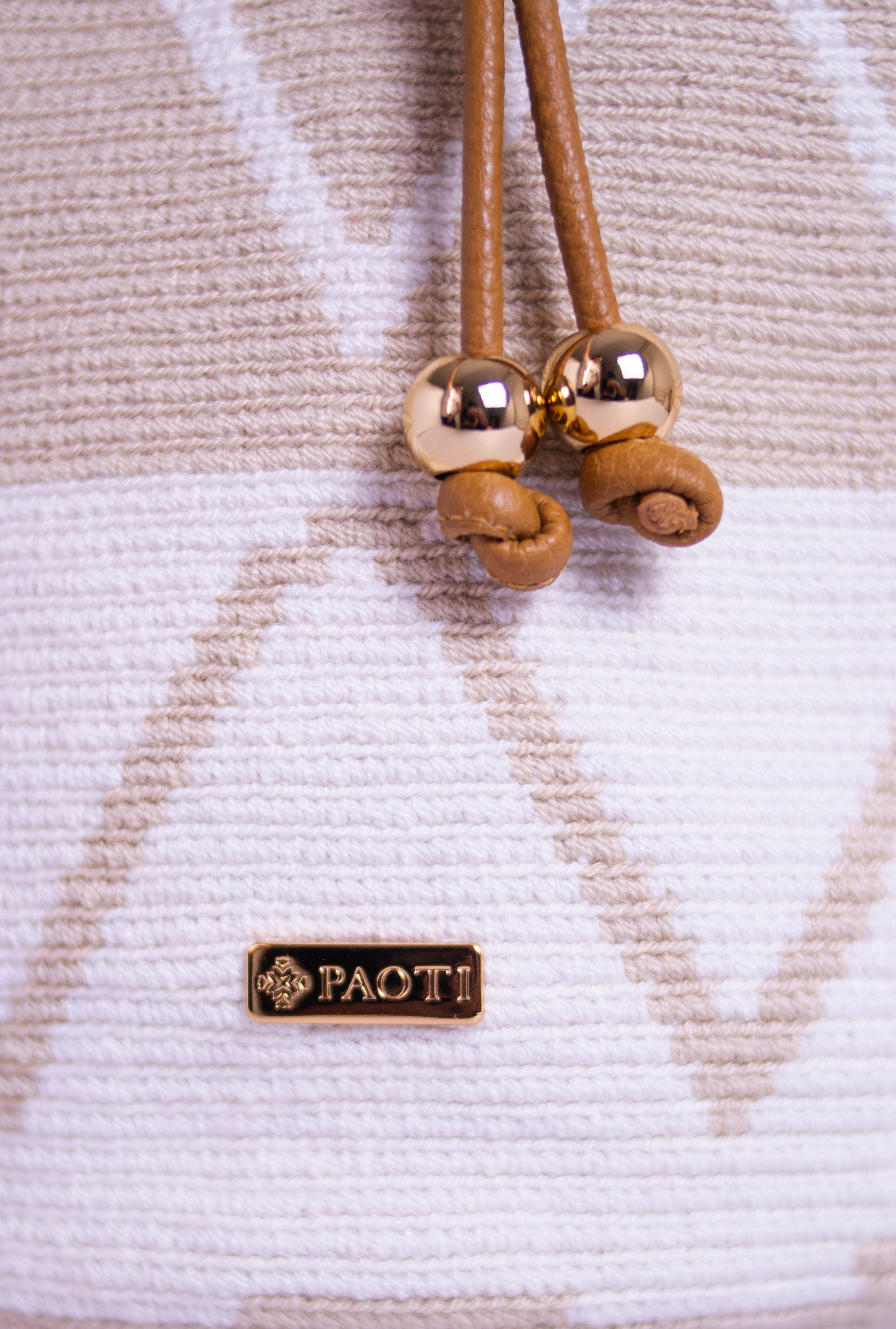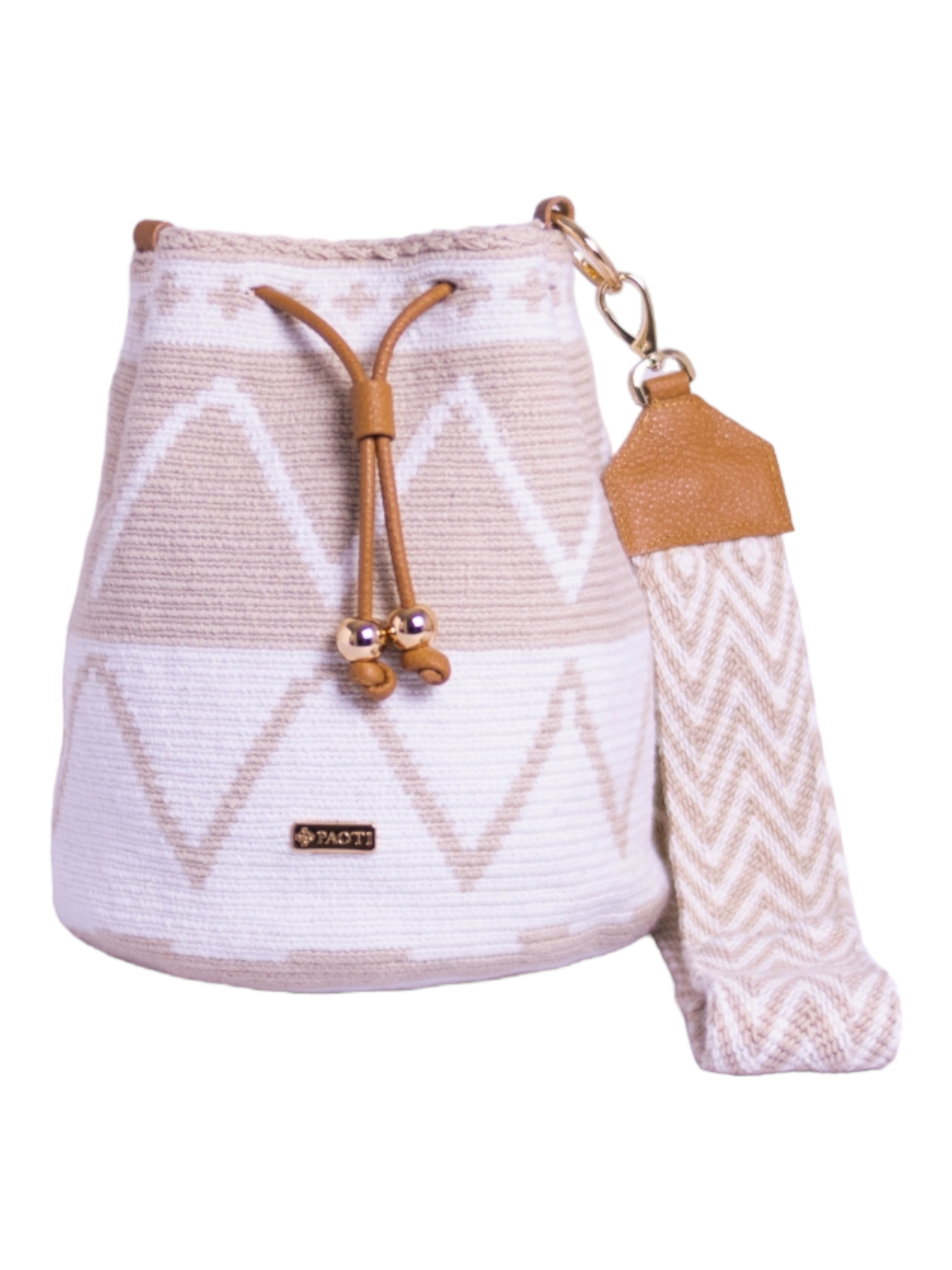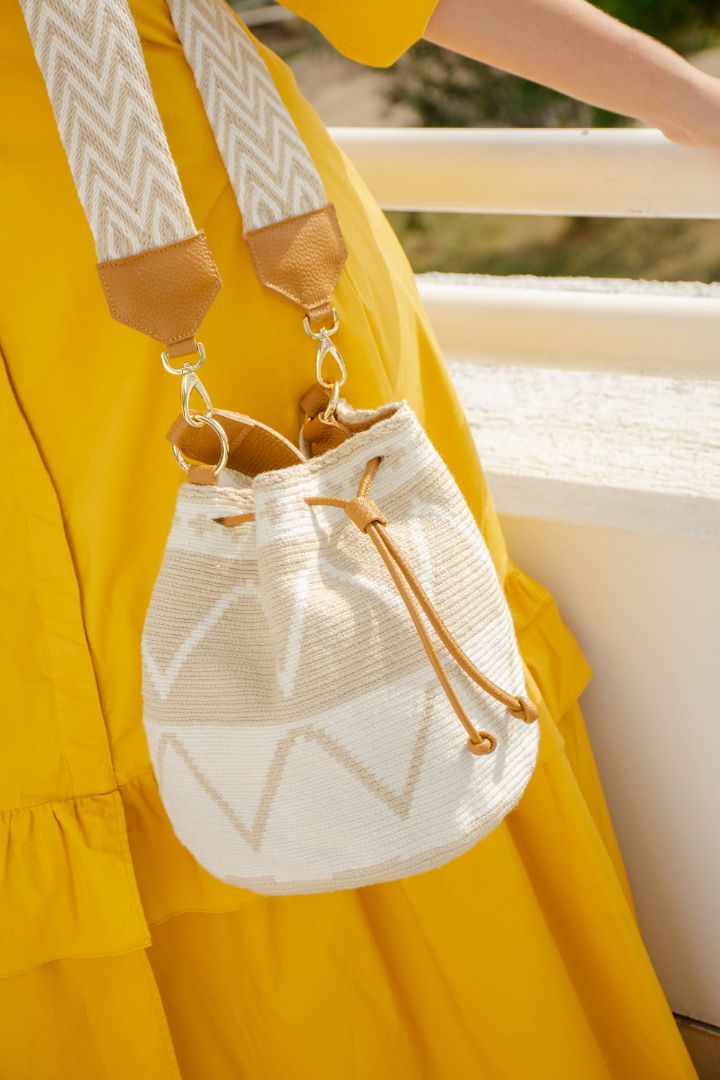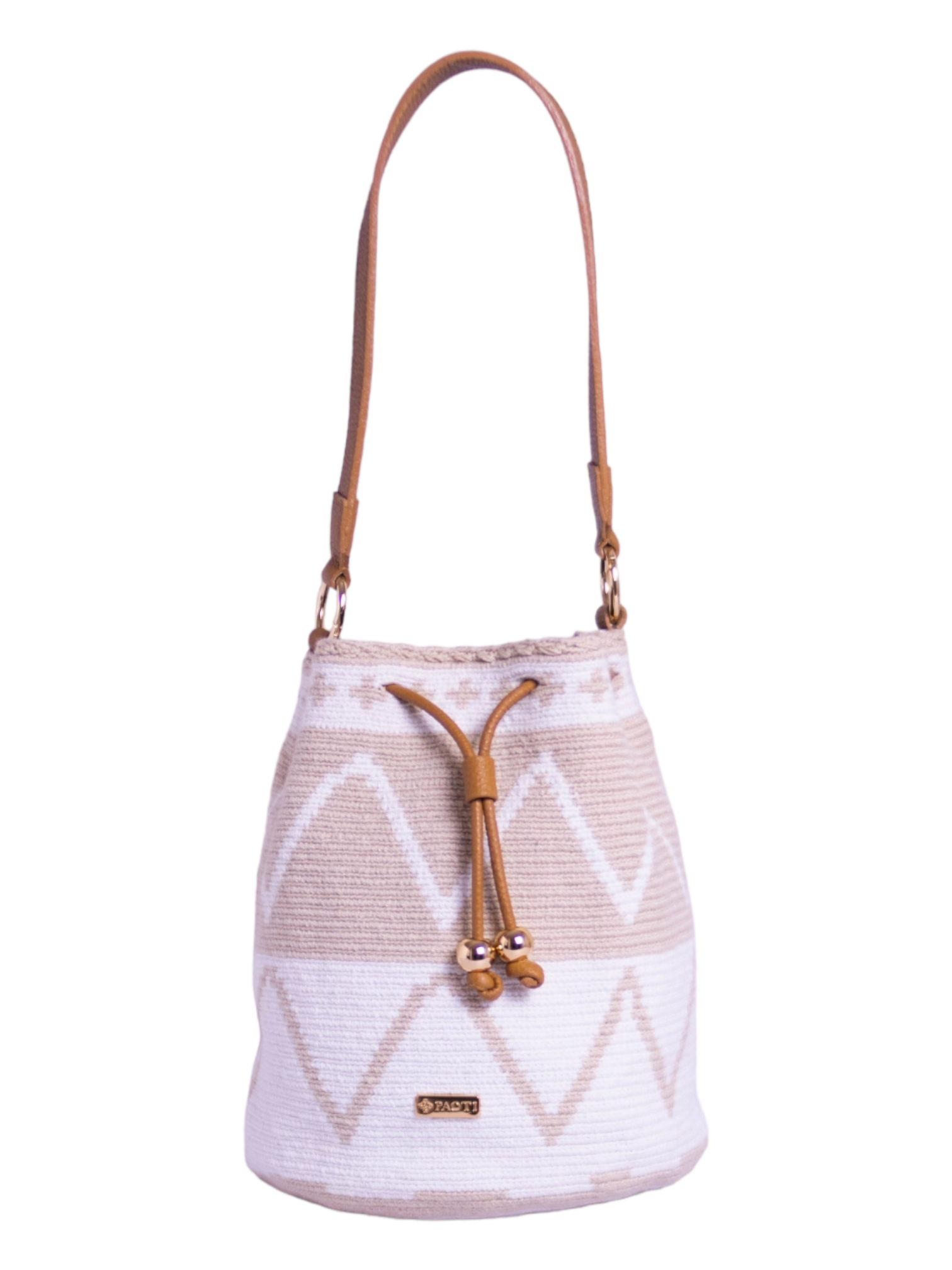 Cartera beige y blanca tejida a mano por mujeres pertenecientes a la tribu Wayuu de la alta Guajira colombiana. Presenta accesorios en piel de cacahuete rosa coral, realizados por maestros artesanos del cuero. Incluye dos correas intercambiables, una de piel y otra de tela, ambas hechas a mano con la mayor dedicación. El bolso está adornado con finos herrajes de la más alta calidad.