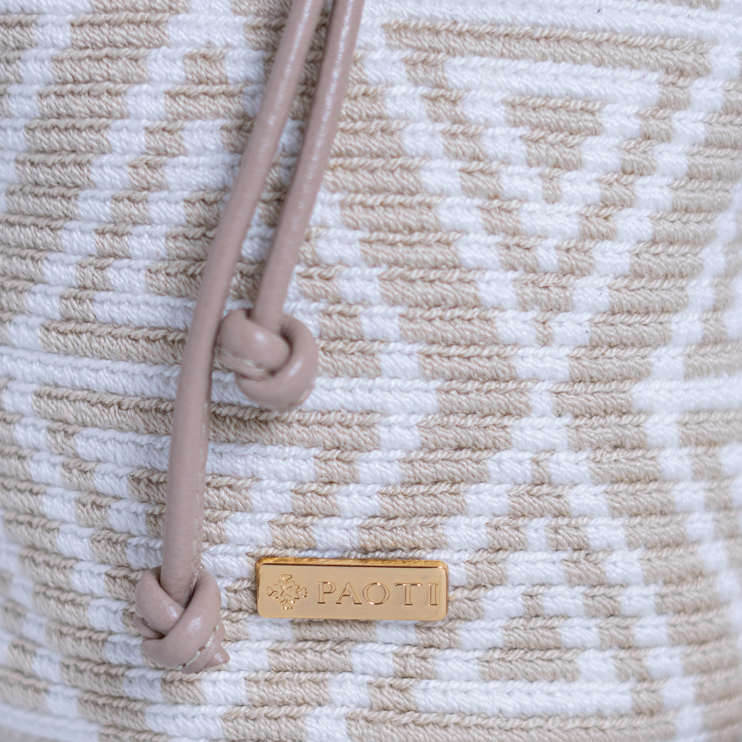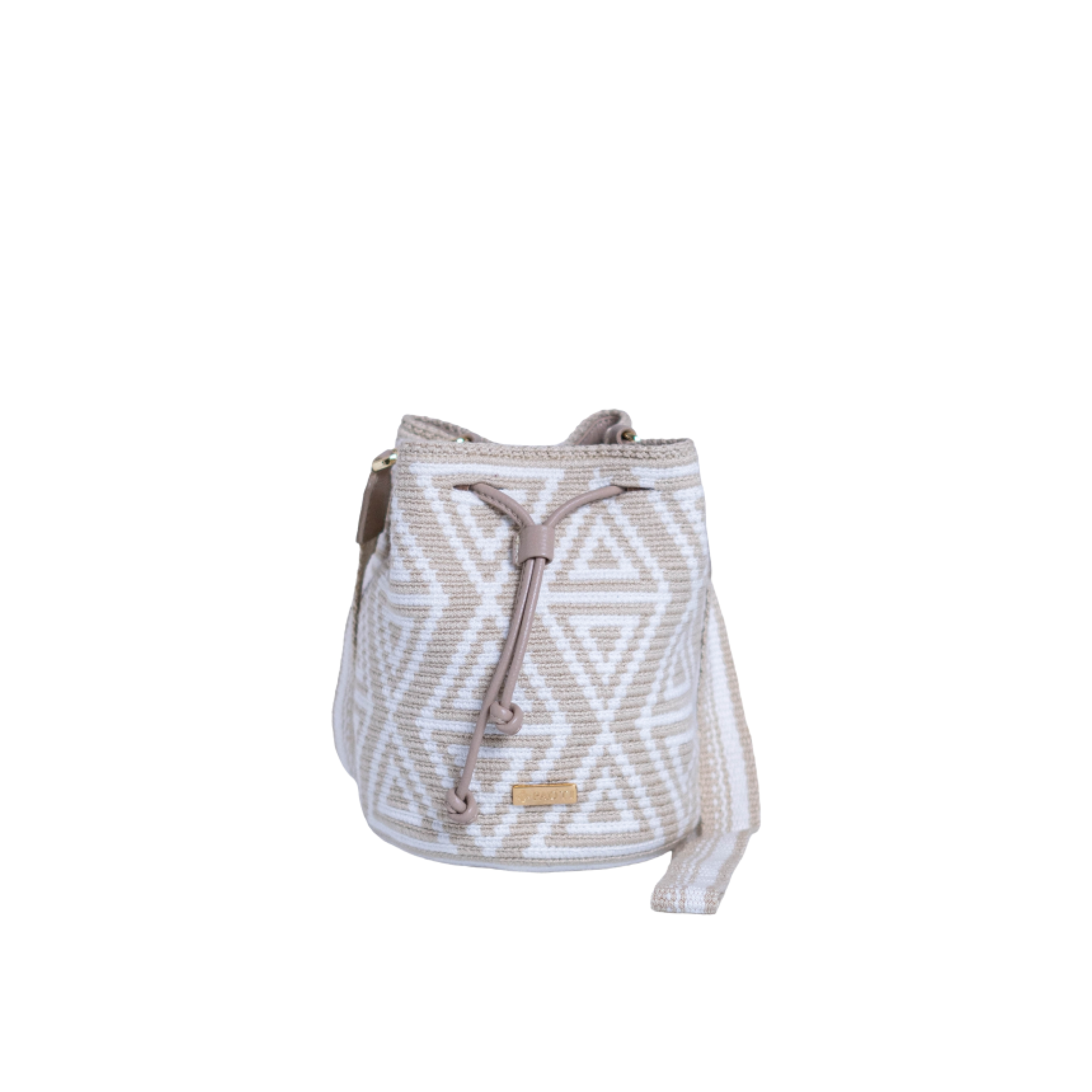 Mini bolso de mano con diseño estampado en tonos beige y blanco, tejido a mano por mujeres pertenecientes a la tribu Wayuu de la alta Guajira colombiana. Cuenta con accesorios de cuero, hechos por maestros artesanos del cuero. Incluye una correa de tela, hecha a mano con la mayor dedicación. El bolso está adornado con finos herrajes de la más alta calidad.